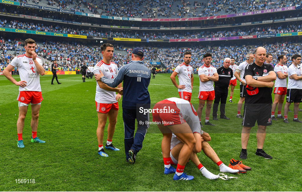 2 September 2018; Dublin manager Jim Gavin shakes hands with Ronan O'Neill of Tyrone after the GAA Football All-Ireland Senior Championship Final match between Dublin and Tyrone at Croke Park in Dublin. Photo by Brendan Moran/Sportsfile