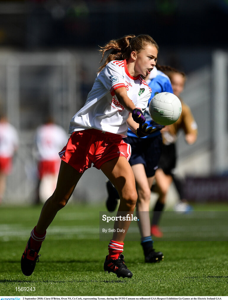 2 September 2018; Ciara O'Brien, Oven NS, Co Cork, representing Tyrone, during the INTO Cumann na mBunscol GAA Respect Exhibition Go Games at the Electric Ireland GAA Football All-Ireland Minor Championship Final match between Kerry and Galway at Croke Park in Dublin. Photo by Seb Daly/Sportsfile