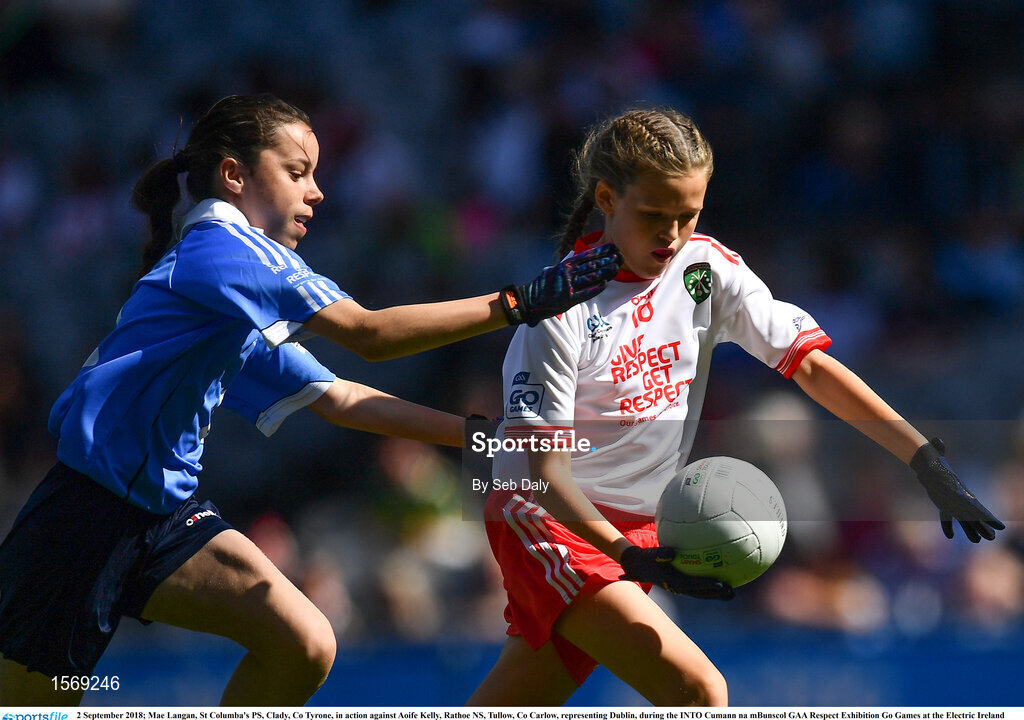 2 September 2018; Mae Langan, St Columba's PS, Clady, Co Tyrone, in action against Aoife Kelly, Rathoe NS, Tullow, Co Carlow, representing Dublin, during the INTO Cumann na mBunscol GAA Respect Exhibition Go Games at the Electric Ireland GAA Football All-Ireland Minor Championship Final match between Kerry and Galway at Croke Park in Dublin. Photo by Seb Daly/Sportsfile