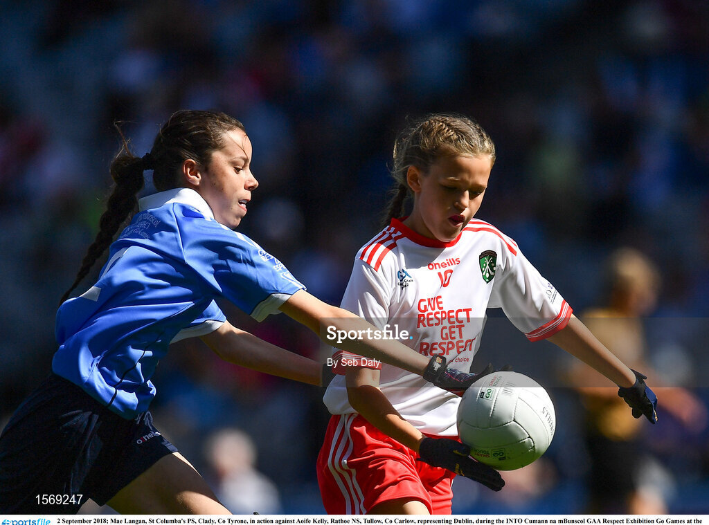 2 September 2018; Mae Langan, St Columba's PS, Clady, Co Tyrone, in action against Aoife Kelly, Rathoe NS, Tullow, Co Carlow, representing Dublin, during the INTO Cumann na mBunscol GAA Respect Exhibition Go Games at the Electric Ireland GAA Football All-Ireland Minor Championship Final match between Kerry and Galway at Croke Park in Dublin. Photo by Seb Daly/Sportsfile