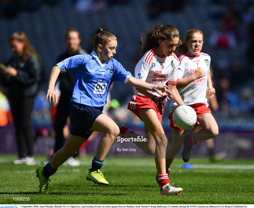 2 September 2018; Anna Murphy, Bansha NS, Co Tipperary, representing Tyrone, in action against Karrie Rudden, Scoil Naomh P·draig, Ballyroan, Co Dublin, during the INTO Cumann na mBunscol GAA Respect Exhibition Go Games at the Electric Ireland GAA Football All-Ireland Minor Championship Final match between Kerry and Galway at Croke Park in Dublin. Photo by Seb Daly/Sportsfile