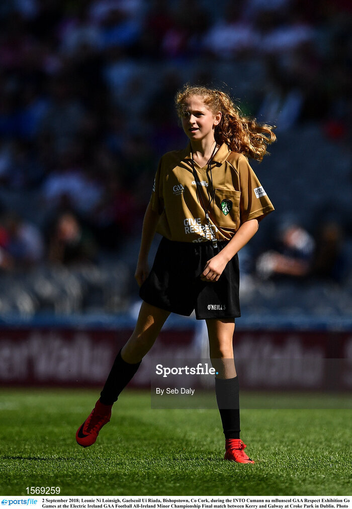 2 September 2018; Leonie Ní Loinsigh, Gaelscoil Uí Riada, Bishopstown, Co Cork, during the INTO Cumann na mBunscol GAA Respect Exhibition Go Games at the Electric Ireland GAA Football All-Ireland Minor Championship Final match between Kerry and Galway at Croke Park in Dublin. Photo by Seb Daly/Sportsfile