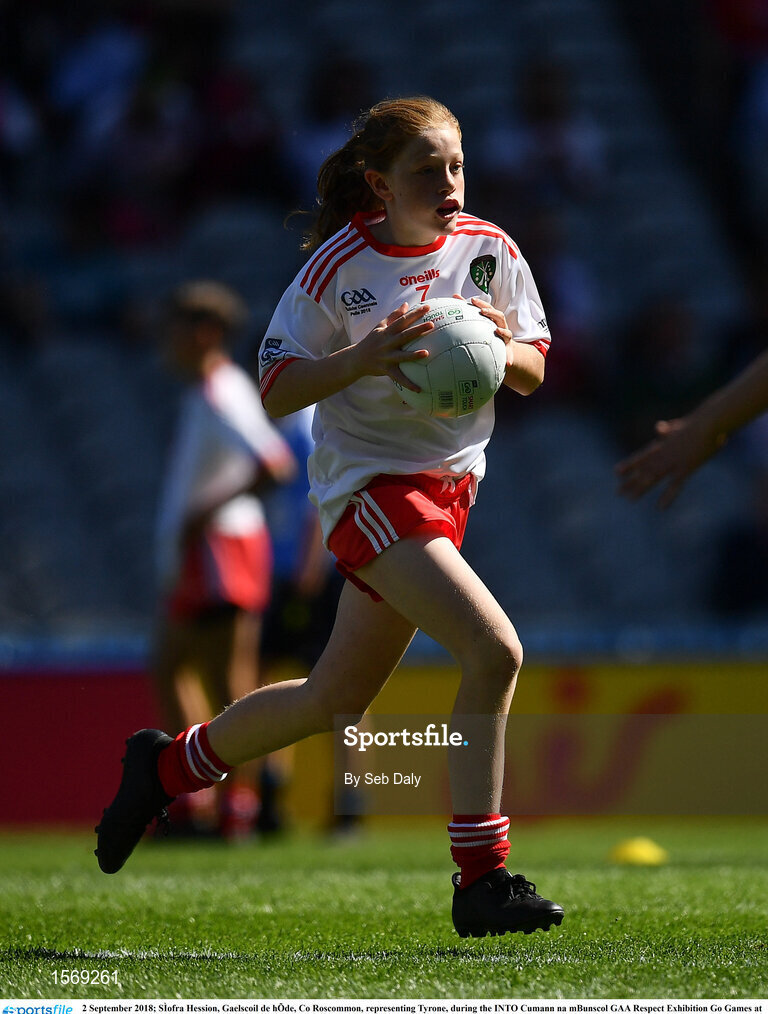 2 September 2018; SÌofra Hession, Gaelscoil de hÕde, Co Roscommon, representing Tyrone, during the INTO Cumann na mBunscol GAA Respect Exhibition Go Games at the Electric Ireland GAA Football All-Ireland Minor Championship Final match between Kerry and Galway at Croke Park in Dublin. Photo by Seb Daly/Sportsfile