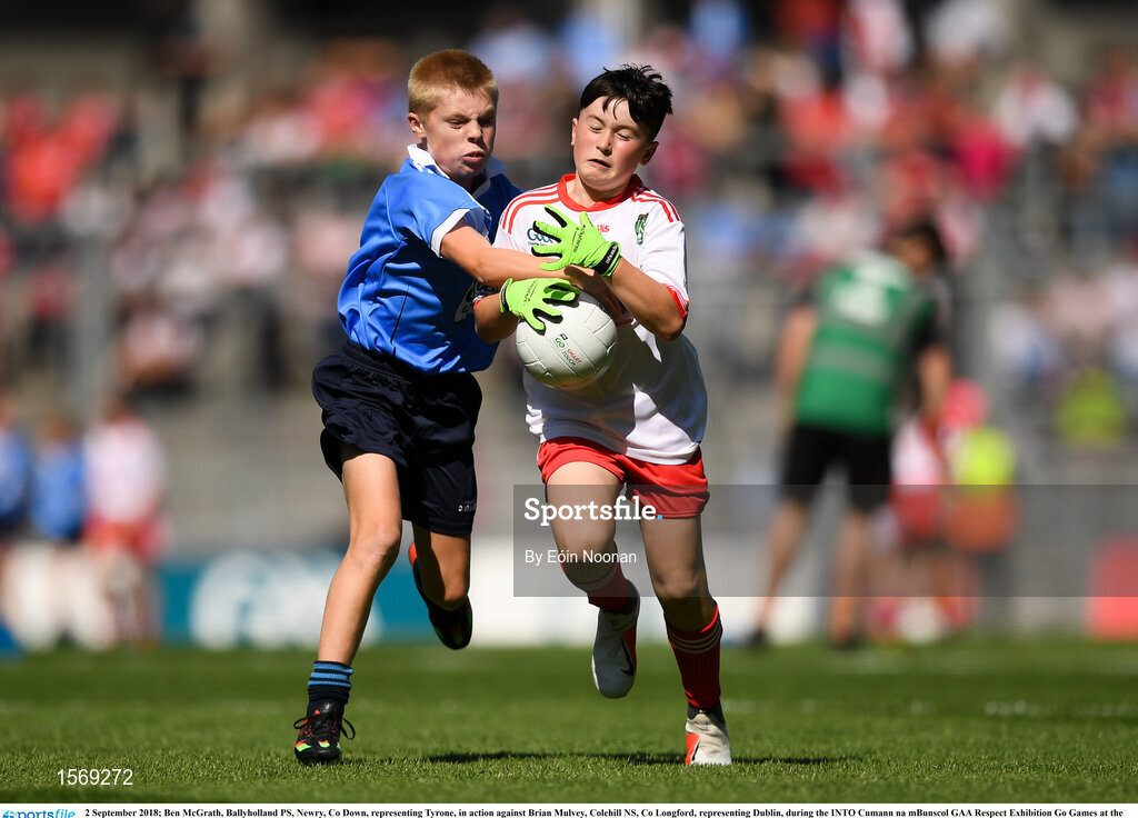 2 September 2018; Ben McGrath, Ballyholland PS, Newry, Co Down, representing Tyrone, in action against Brian Mulvey, Colehill NS, Co Longford, representing Dublin, during the INTO Cumann na mBunscol GAA Respect Exhibition Go Games at the Electric Ireland GAA Football All-Ireland Minor Championship Final match between Kerry and Galway at Croke Park in Dublin. Photo by Eóin Noonan/Sportsfile