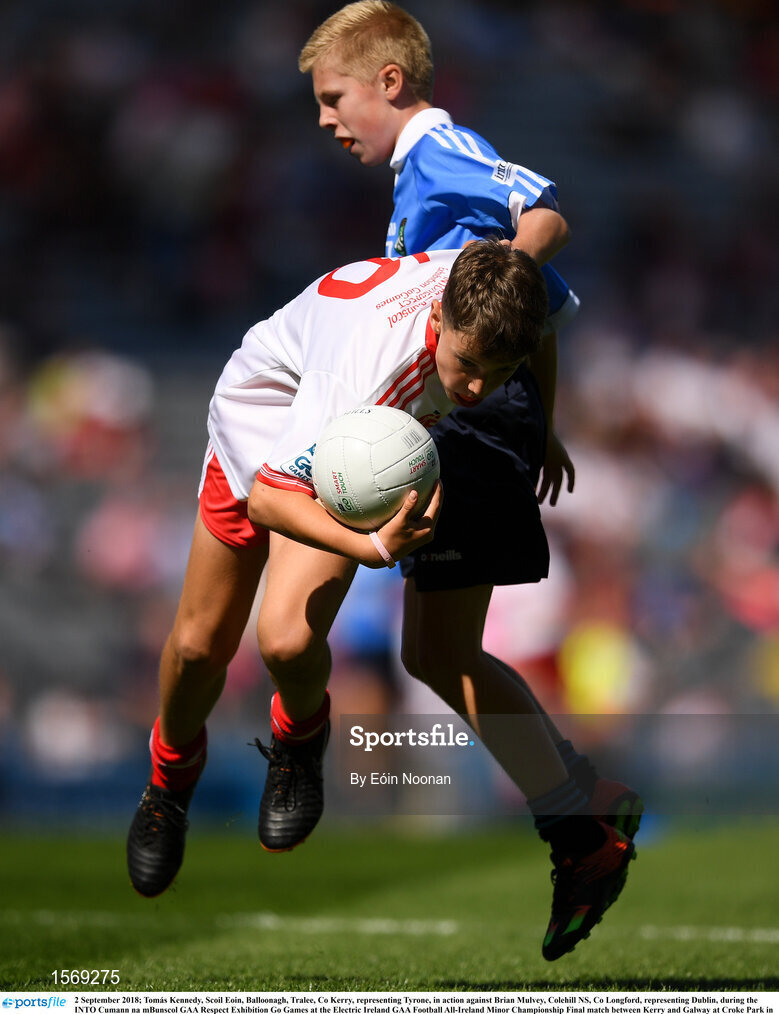 2 September 2018; Tomás Kennedy, Scoil Eoin, Balloonagh, Tralee, Co Kerry, representing Tyrone, in action against Brian Mulvey, Colehill NS, Co Longford, representing Dublin, during the INTO Cumann na mBunscol GAA Respect Exhibition Go Games at the Electric Ireland GAA Football All-Ireland Minor Championship Final match between Kerry and Galway at Croke Park in Dublin. Photo by Eóin Noonan/Sportsfile