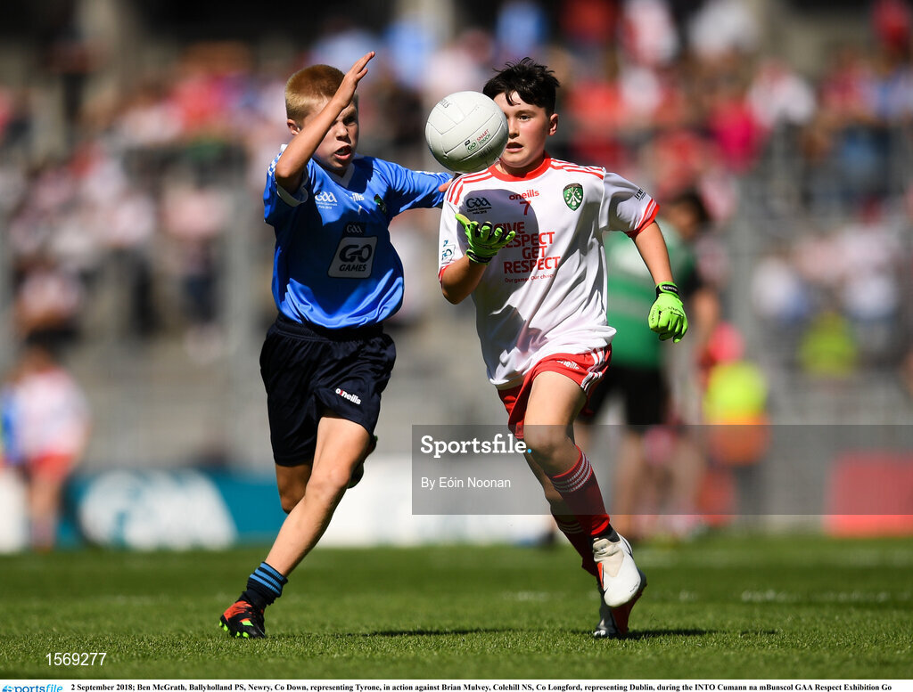 2 September 2018; Ben McGrath, Ballyholland PS, Newry, Co Down, representing Tyrone, in action against Brian Mulvey, Colehill NS, Co Longford, representing Dublin, during the INTO Cumann na mBunscol GAA Respect Exhibition Go Games at the Electric Ireland GAA Football All-Ireland Minor Championship Final match between Kerry and Galway at Croke Park in Dublin. Photo by Eóin Noonan/Sportsfile