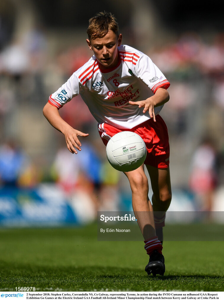 2 September 2018; Stephen Curley, Corrandulla NS, Co Galway, representing Tyrone, in action during the INTO Cumann na mBunscol GAA Respect Exhibition Go Games at the Electric Ireland GAA Football All-Ireland Minor Championship Final match between Kerry and Galway at Croke Park in Dublin. Photo by Eóin Noonan/Sportsfile