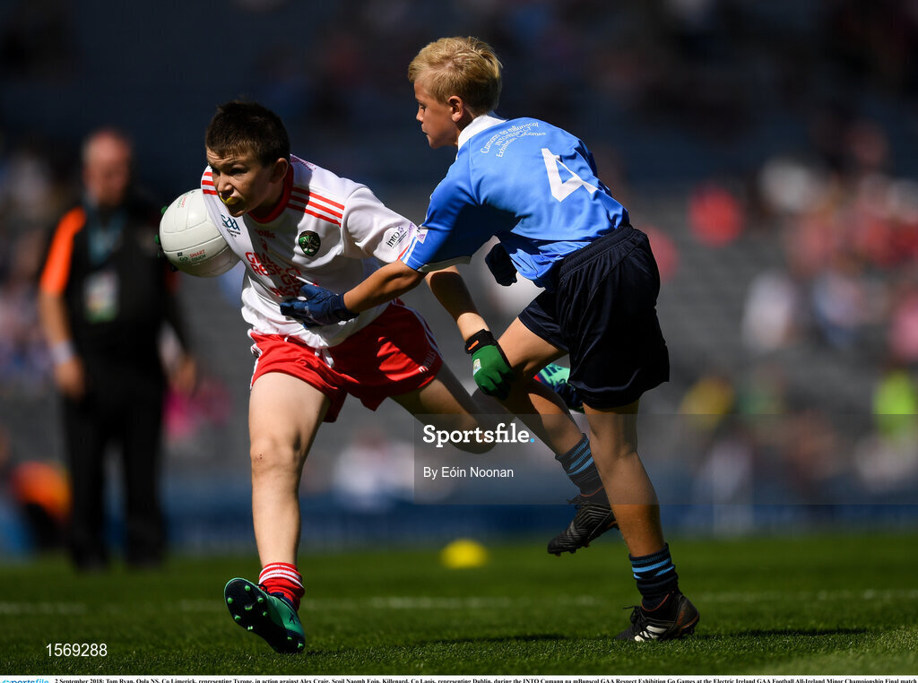 2 September 2018; Tom Ryan, Oola NS, Co Limerick, representing Tyrone, in action against Alex Craig, Scoil Naomh Eoin, Killenard, Co Laois, representing Dublin, during the INTO Cumann na mBunscol GAA Respect Exhibition Go Games at the Electric Ireland GAA Football All-Ireland Minor Championship Final match between Kerry and Galway at Croke Park in Dublin. Photo by Eóin Noonan/Sportsfile