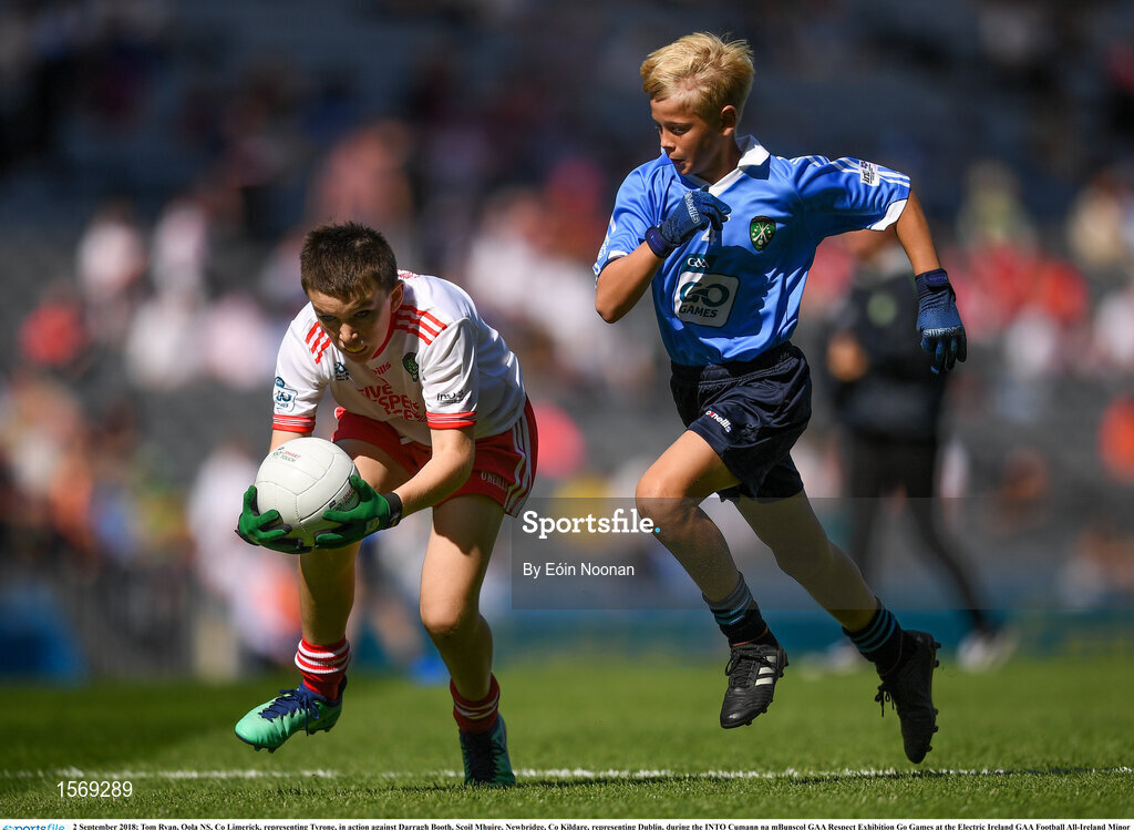 2 September 2018; Tom Ryan, Oola NS, Co Limerick, representing Tyrone, in action against Darragh Booth, Scoil Mhuire, Newbridge, Co Kildare, representing Dublin, during the INTO Cumann na mBunscol GAA Respect Exhibition Go Games at the Electric Ireland GAA Football All-Ireland Minor Championship Final match between Kerry and Galway at Croke Park in Dublin. Photo by Eóin Noonan/Sportsfile
