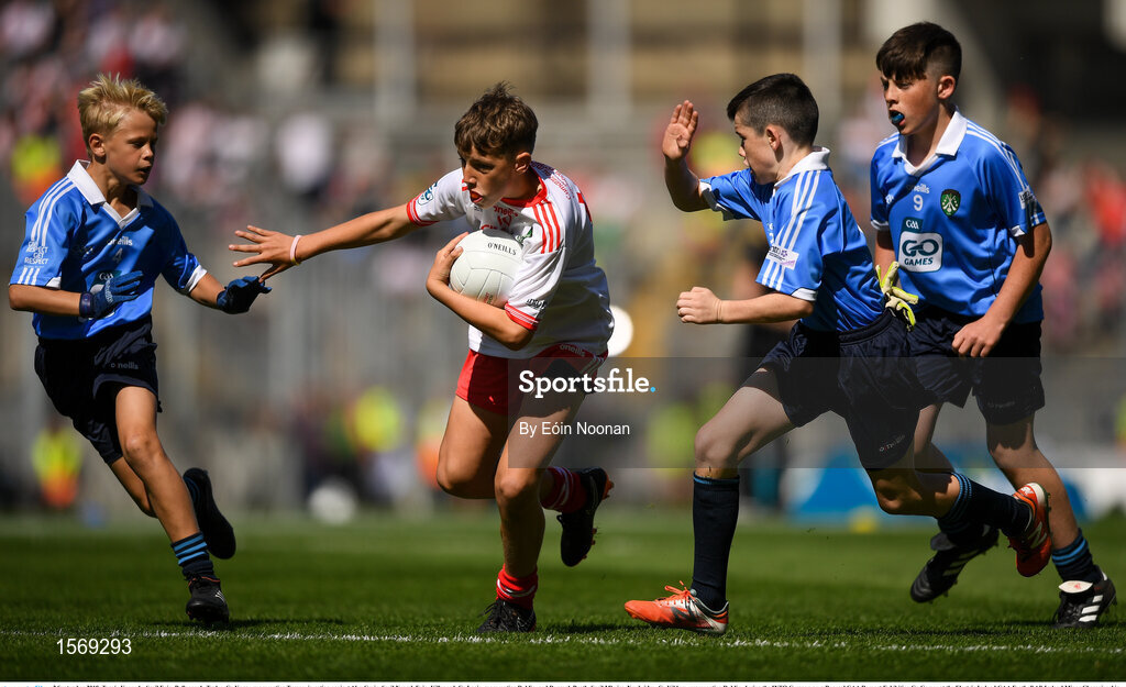 2 September 2018; Tomás Kennedy, Scoil Eoin, Balloonagh, Tralee, Co Kerry, representing Tyrone, in action against Alex Craig, Scoil Naomh Eoin, Killenard, Co Laois, representing Dublin, and Darragh Booth, Scoil Mhuire, Newbridge, Co Kildare, representing Dublin, during the INTO Cumann na mBunscol GAA Respect Exhibition Go Games at the Electric Ireland GAA Football All-Ireland Minor Championship Final match between Kerry and Galway at Croke Park in Dublin. Photo by Eóin Noonan/Sportsfile