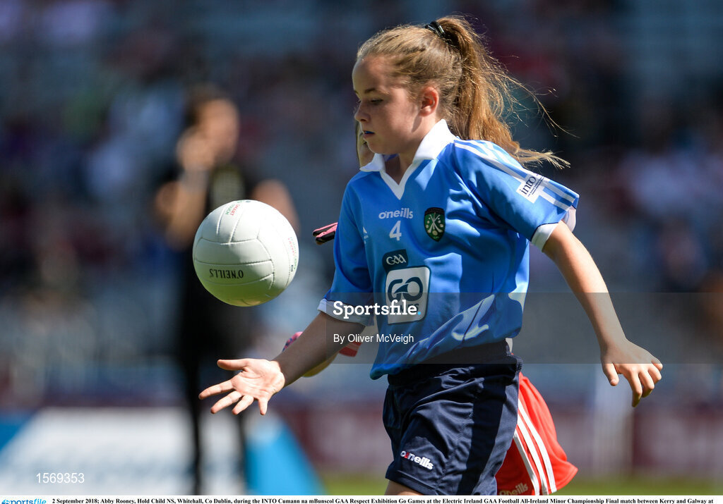 2 September 2018; Abby Rooney, Hold Child NS, Whitehall, Co Dublin, during the INTO Cumann na mBunscol GAA Respect Exhibition Go Games at the Electric Ireland GAA Football All-Ireland Minor Championship Final match between Kerry and Galway at Croke Park in Dublin. Photo by Oliver McVeigh/Sportsfile