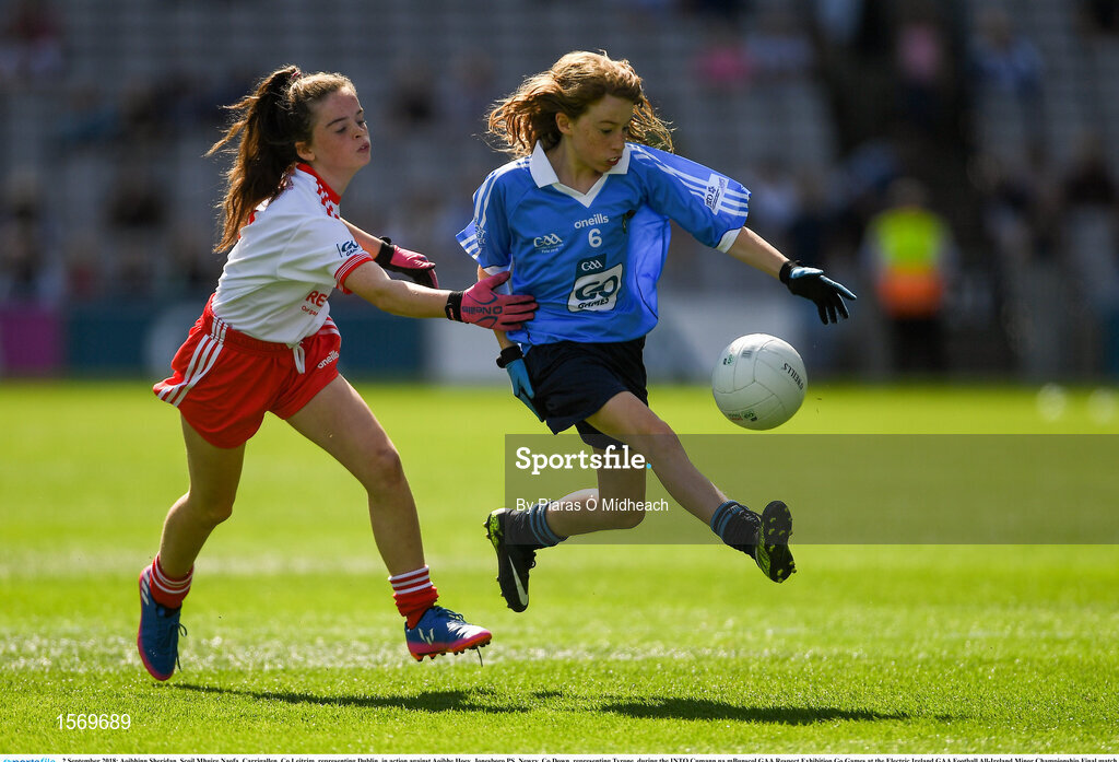 2 September 2018; Aoibhinn Sheridan, Scoil Mhuire Naofa, Carrigallen, Co Leitrim, representing Dublin, in action against Aoibhe Hoey, Jonesboro PS, Newry, Co Down, representing Tyrone, during the INTO Cumann na mBunscol GAA Respect Exhibition Go Games at the Electric Ireland GAA Football All-Ireland Minor Championship Final match between Kerry and Galway at Croke Park in Dublin. Photo by Piaras Ó Mídheach/Sportsfile