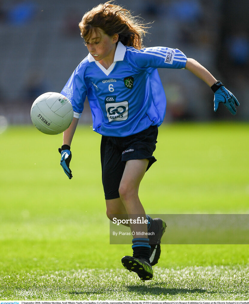 2 September 2018; Aoibhinn Sheridan, Scoil Mhuire Naofa, Carrigallen, Co Leitrim, representing Dublin, during the INTO Cumann na mBunscol GAA Respect Exhibition Go Games at the Electric Ireland GAA Football All-Ireland Minor Championship Final match between Kerry and Galway at Croke Park in Dublin. Photo by Piaras Ó Mídheach/Sportsfile