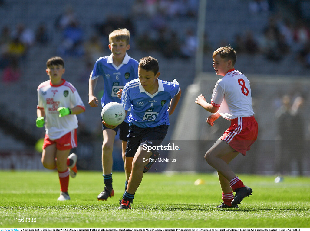 2 September 2018; Conor Fox, Tubber NS, Co Offaly, representing Dublin, in action against Stephen Curley, Corrandulla NS, Co Galway, representing Tyrone, during the INTO Cumann na mBunscol GAA Respect Exhibition Go Games at the Electric Ireland GAA Football All-Ireland Minor Championship Final match between Kerry and Galway at Croke Park in Dublin. Photo by Ray McManus/Sportsfile