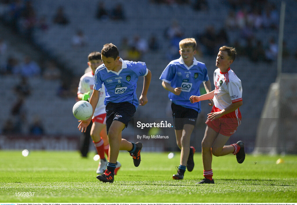 2 September 2018; Conor Fox, Tubber NS, Co Offaly, representing Dublin, in action against Stephen Curley, Corrandulla NS, Co Galway, representing Tyrone, during the INTO Cumann na mBunscol GAA Respect Exhibition Go Games at the Electric Ireland GAA Football All-Ireland Minor Championship Final match between Kerry and Galway at Croke Park in Dublin. Photo by Ray McManus/Sportsfile