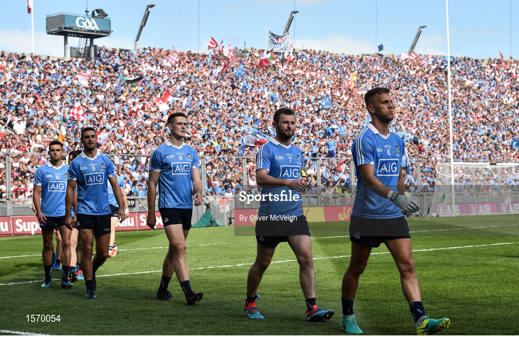2 September 2018; Niall Scully, James McCarthy, Brian Fenton, Jack McCaffrey and Jonny Cooper of Dublin parade in front of the hill before the GAA Football All-Ireland Senior Championship Final match between Dublin and Tyrone at Croke Park in Dublin. Photo by Oliver McVeigh/Sportsfile