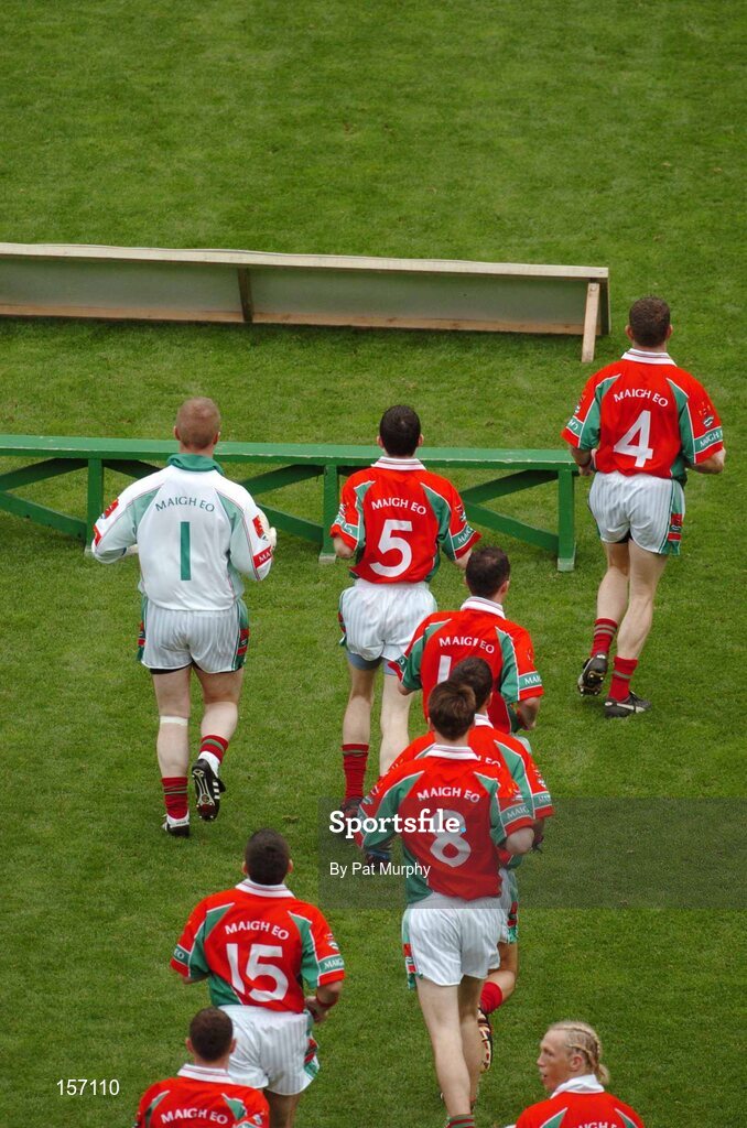 26 September 2004; Mayo players make their way to the bench for the team photograph. Bank of Ireland All-Ireland Senior Football Championship Final, Kerry v Mayo, Croke Park, Dublin. Picture credit; Pat Murphy / SPORTSFILE *** Local Caption *** Any photograph taken by SPORTSFILE during, or in connection with, the 2004 Bank of Ireland All-Ireland Senior Football Final which displays GAA logos or contains an image or part of an image of any GAA intellectual property, or, which contains images of a GAA player/players in their playing uniforms, may only be used for editorial and non-advertising purposes. Use of photographs for advertising, as posters or for purchase separately is strictly prohibited unless prior written approval has been obtained from the Gaelic Athletic Association.