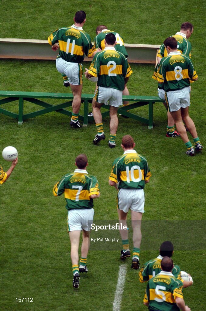 26 September 2004; The Kerry players make their way to the bench for the team photograph. Bank of Ireland All-Ireland Senior Football Championship Final, Kerry v Mayo, Croke Park, Dublin. Picture credit; Pat Murphy / SPORTSFILE *** Local Caption *** Any photograph taken by SPORTSFILE during, or in connection with, the 2004 Bank of Ireland All-Ireland Senior Football Final which displays GAA logos or contains an image or part of an image of any GAA intellectual property, or, which contains images of a GAA player/players in their playing uniforms, may only be used for editorial and non-advertising purposes. Use of photographs for advertising, as posters or for purchase separately is strictly prohibited unless prior written approval has been obtained from the Gaelic Athletic Association.