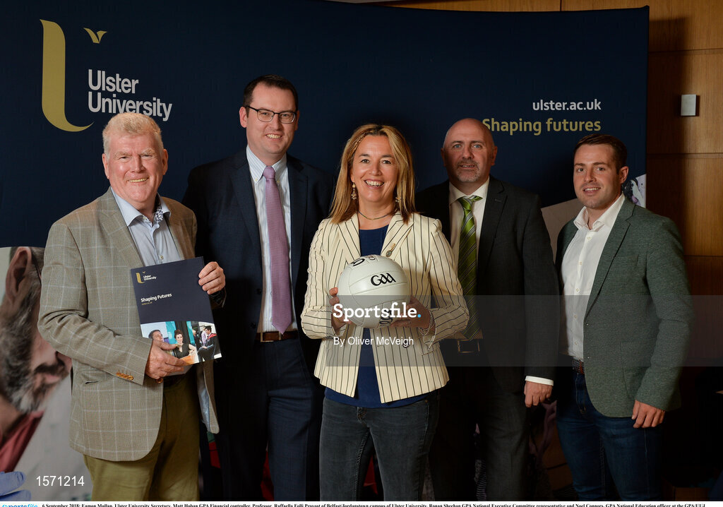 6 September 2018; Eamon Mullan, Ulster University Secretary, Matt Hoban GPA Financial controller, Professor Raffaella Folli Provost of Belfast/Jordanstown campus of Ulster University, Ronan Sheehan GPA National Executive Committee representative and Noel Connors, GPA National Education officer at the GPA/UUJ Enhanced Scholarships Announcement at the University of Ulster in Belfast, Co Antrim. Photo by Oliver McVeigh/Sportsfile