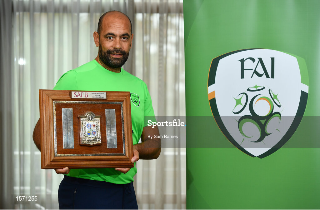 6 September 2018; Republic of Ireland U16 Head Coach Paul Osam with the Victory Shield at the 2018 Victory Shield launch at The Rose Hotel, in Tralee, Co. Kerry. Photo by Sam Barnes/Sportsfile