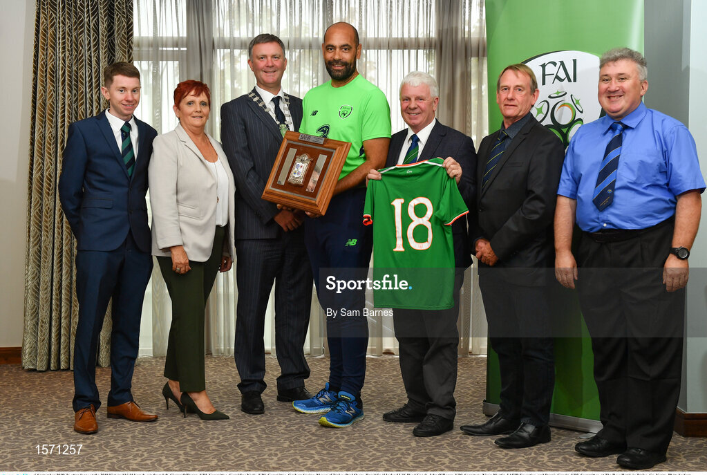 6 September 2018; In attendance at the 2018 Victory Shield launch, are from left, Ciaran O’Regan, KDL Committee, Geraldine Nagle, KDL Committee, Graham Spring, Mayor of Tralee, Paul Osam, Republic of Ireland U16 Head Coach, John O’Regan, KDL Secretary, Nixon Mortin, SAFIB Executive, and Dennis Guerin, KDL Committee, at The Rose Hotel, in Tralee, Co. Kerry. Photo by Sam Barnes/Sportsfile