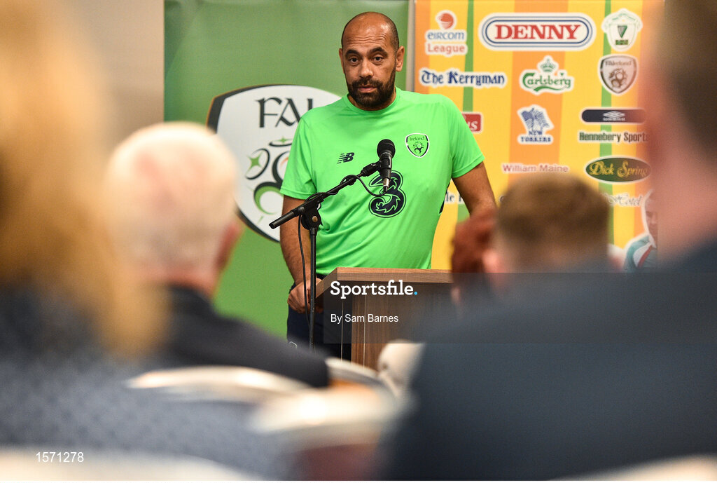 6 September 2018; Republic of Ireland U16 Head Coach, Paul Osam, speaking at the 2018 Victory Shield launch at The Rose Hotel in Tralee, Co. Kerry. Photo by Sam Barnes/Sportsfile