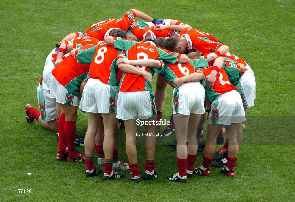 26 September 2004; The Mayo team in a team huddle before the game. Bank of Ireland All-Ireland Senior Football Championship Final, Kerry v Mayo, Croke Park, Dublin. Picture credit; Pat Murphy / SPORTSFILE *** Local Caption *** Any photograph taken by SPORTSFILE during, or in connection with, the 2004 Bank of Ireland All-Ireland Senior Football Final which displays GAA logos or contains an image or part of an image of any GAA intellectual property, or, which contains images of a GAA player/players in their playing uniforms, may only be used for editorial and non-advertising purposes. Use of photographs for advertising, as posters or for purchase separately is strictly prohibited unless prior written approval has been obtained from the Gaelic Athletic Association.