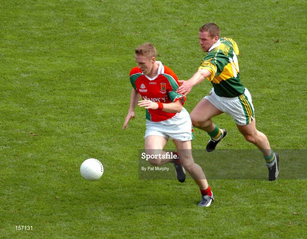 26 September 2004; David Heaney, Mayo, in action against Dara O Cinneide, Kerry. Bank of Ireland All-Ireland Senior Football Championship Final, Kerry v Mayo, Croke Park, Dublin. Picture credit; Pat Murphy / SPORTSFILE *** Local Caption *** Any photograph taken by SPORTSFILE during, or in connection with, the 2004 Bank of Ireland All-Ireland Senior Football Final which displays GAA logos or contains an image or part of an image of any GAA intellectual property, or, which contains images of a GAA player/players in their playing uniforms, may only be used for editorial and non-advertising purposes. Use of photographs for advertising, as posters or for purchase separately is strictly prohibited unless prior written approval has been obtained from the Gaelic Athletic Association.
