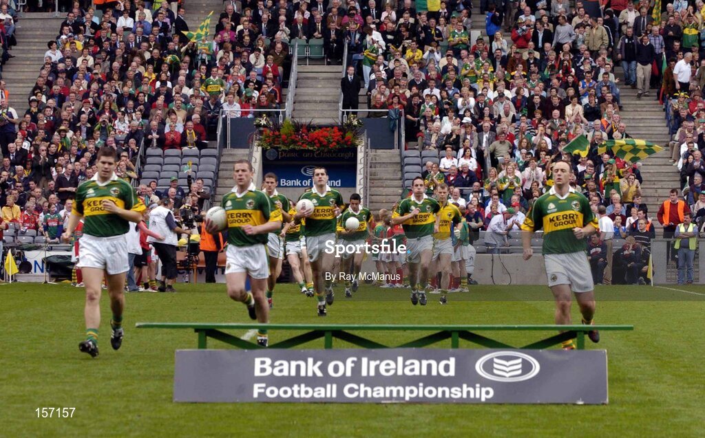 26 September 2004; The Kerry players make their way to the bench for the team photograph. Bank of Ireland All-Ireland Senior Football Championship Final, Kerry v Mayo, Croke Park, Dublin. Picture credit; Ray McManus / SPORTSFILE *** Local Caption *** Any photograph taken by SPORTSFILE during, or in connection with, the 2004 Bank of Ireland All-Ireland Senior Football Final which displays GAA logos or contains an image or part of an image of any GAA intellectual property, or, which contains images of a GAA player/players in their playing uniforms, may only be used for editorial and non-advertising purposes. Use of photographs for advertising, as posters or for purchase separately is strictly prohibited unless prior written approval has been obtained from the Gaelic Athletic Association.