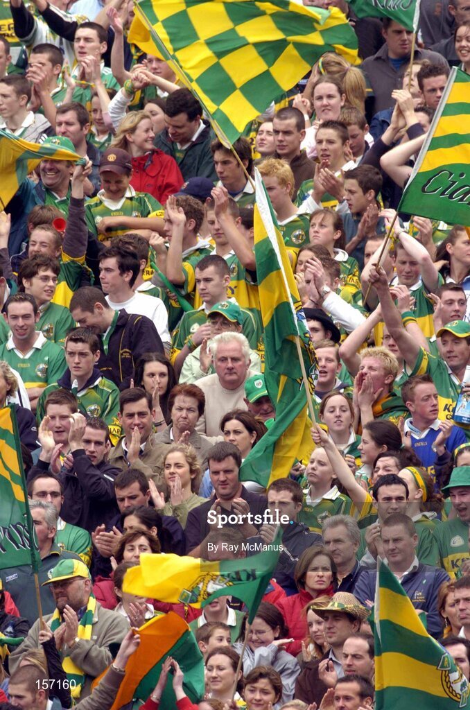 26 September 2004; Kerry fans cheer on their side during the game. Bank of Ireland All-Ireland Senior Football Championship Final, Kerry v Mayo, Croke Park, Dublin. Picture credit; Ray McManus / SPORTSFILE *** Local Caption *** Any photograph taken by SPORTSFILE during, or in connection with, the 2004 Bank of Ireland All-Ireland Senior Football Final which displays GAA logos or contains an image or part of an image of any GAA intellectual property, or, which contains images of a GAA player/players in their playing uniforms, may only be used for editorial and non-advertising purposes. Use of photographs for advertising, as posters or for purchase separately is strictly prohibited unless prior written approval has been obtained from the Gaelic Athletic Association.