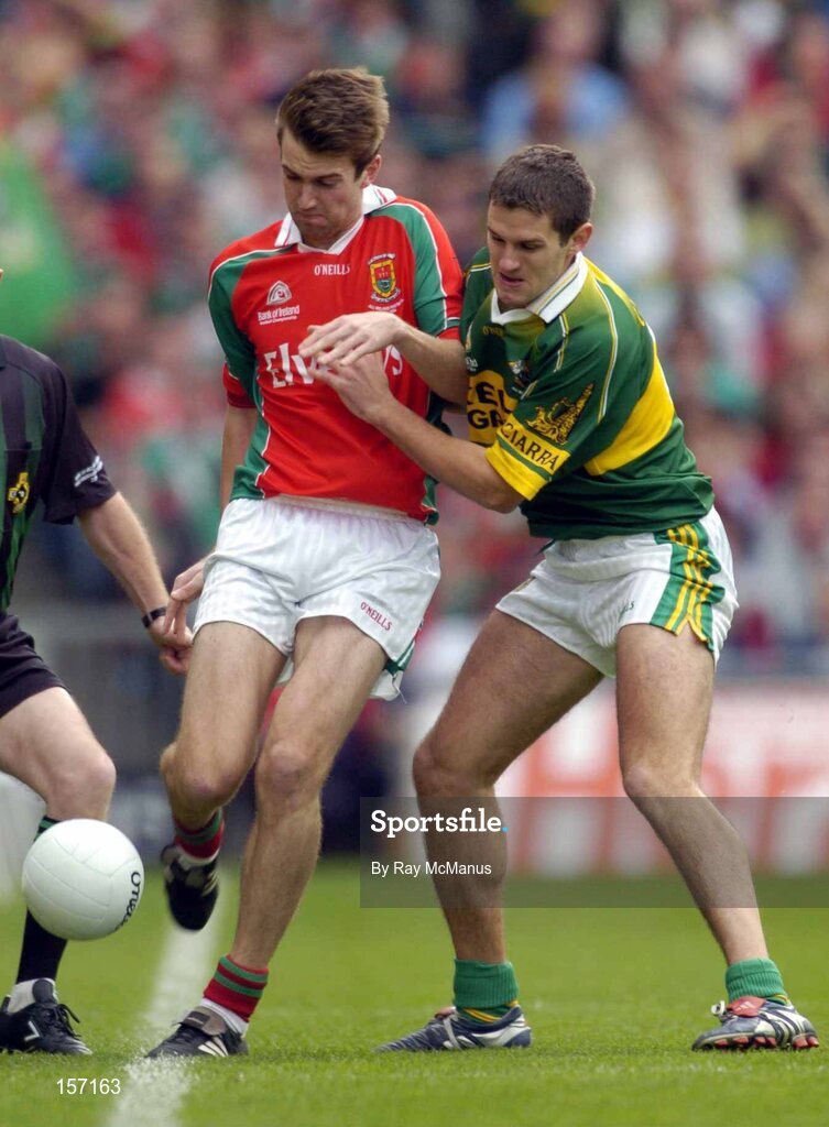 26 September 2004; Ronan McGarrity, Mayo, in action against Eoin Brosnan, Kerry. Bank of Ireland All-Ireland Senior Football Championship Final, Kerry v Mayo, Croke Park, Dublin. Picture credit; Ray McManus / SPORTSFILE *** Local Caption *** Any photograph taken by SPORTSFILE during, or in connection with, the 2004 Bank of Ireland All-Ireland Senior Football Final which displays GAA logos or contains an image or part of an image of any GAA intellectual property, or, which contains images of a GAA player/players in their playing uniforms, may only be used for editorial and non-advertising purposes. Use of photographs for advertising, as posters or for purchase separately is strictly prohibited unless prior written approval has been obtained from the Gaelic Athletic Association.