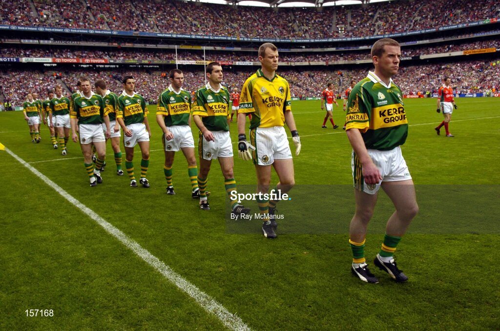 26 September 2004; The Kerry team led by Dara O Cinneide during the pre-match parade. Bank of Ireland All-Ireland Senior Football Championship Final, Kerry v Mayo, Croke Park, Dublin. Picture credit; Ray McManus / SPORTSFILE *** Local Caption *** Any photograph taken by SPORTSFILE during, or in connection with, the 2004 Bank of Ireland All-Ireland Senior Football Final which displays GAA logos or contains an image or part of an image of any GAA intellectual property, or, which contains images of a GAA player/players in their playing uniforms, may only be used for editorial and non-advertising purposes. Use of photographs for advertising, as posters or for purchase separately is strictly prohibited unless prior written approval has been obtained from the Gaelic Athletic Association.