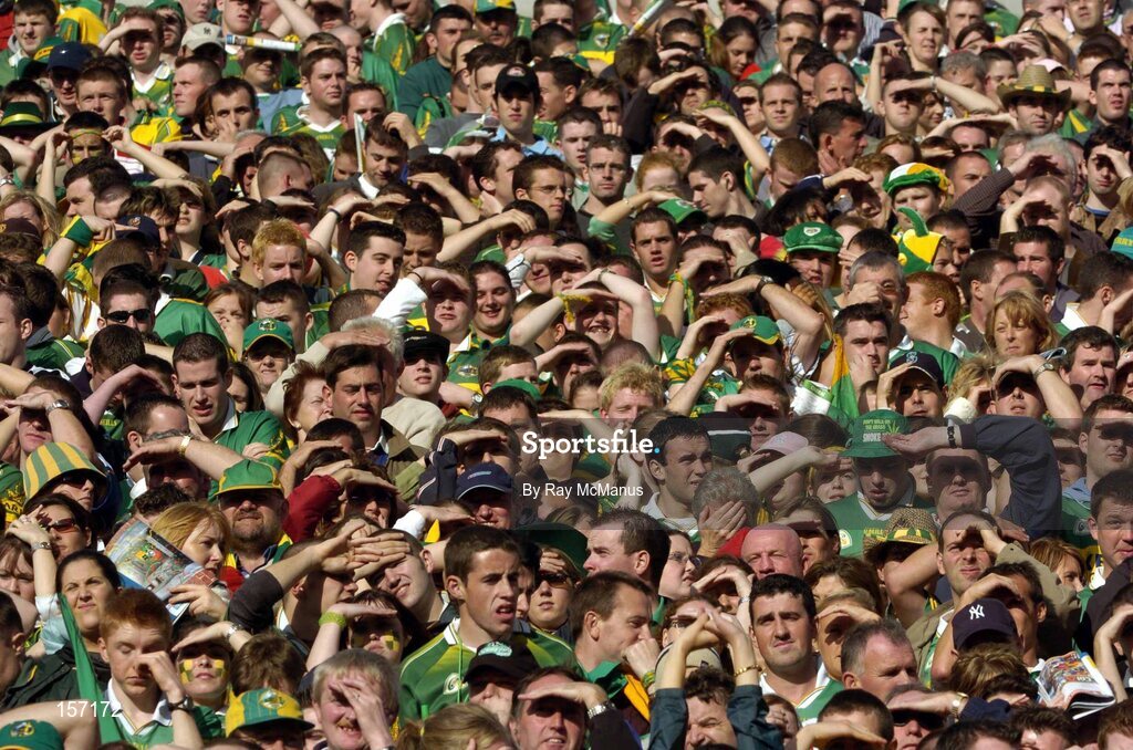 26 September 2004; Kerry fans watch the game despite the strong sunshine. Bank of Ireland All-Ireland Senior Football Championship Final, Kerry v Mayo, Croke Park, Dublin. Picture credit; Ray McManus / SPORTSFILE *** Local Caption *** Any photograph taken by SPORTSFILE during, or in connection with, the 2004 Bank of Ireland All-Ireland Senior Football Final which displays GAA logos or contains an image or part of an image of any GAA intellectual property, or, which contains images of a GAA player/players in their playing uniforms, may only be used for editorial and non-advertising purposes. Use of photographs for advertising, as posters or for purchase separately is strictly prohibited unless prior written approval has been obtained from the Gaelic Athletic Association.