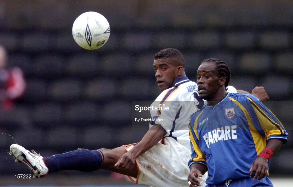 3 October 2004; Jermaine Sandvliet, Drogheda United, in action against Eric Levine, Longford Town. FAI Carlsberg Cup Semi-Final, Longford Town v Drogheda United, Flancare Park, Longford. Picture credit; David Maher / SPORTSFILE