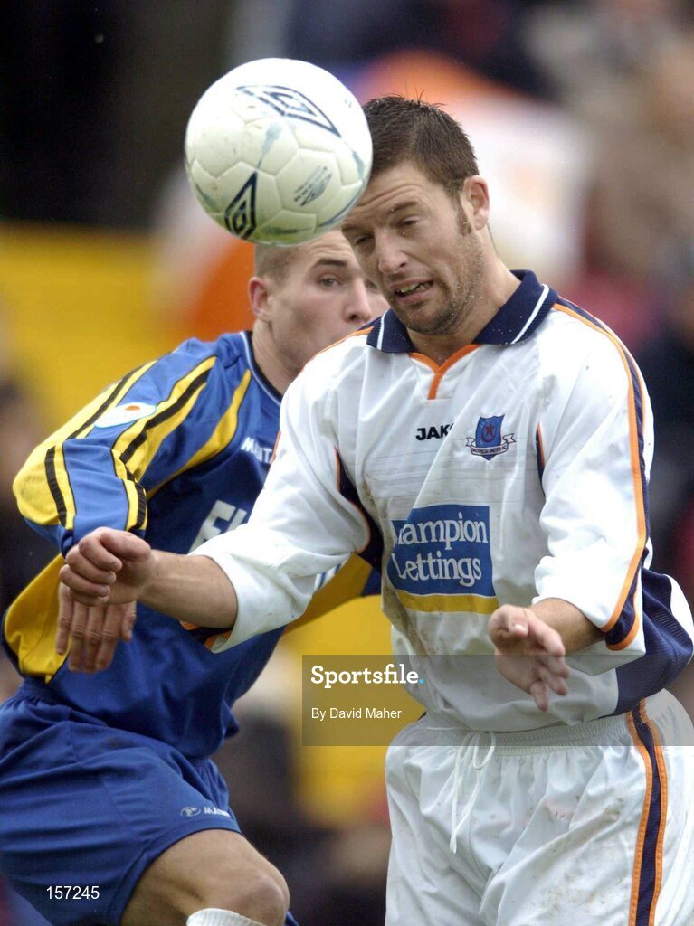 3 October 2004; John Flanagan, Drogheda United, in action against Shane Barrett, Longford Town. FAI Carlsberg Cup Semi-Final, Longford Town v Drogheda United, Flancare Park, Longford. Picture credit; David Maher / SPORTSFILE