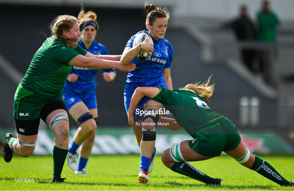 9 September 2018; Nikki Caughey of Leinster is tackled by Denise Redmond, left, and Nichola Fryday of Connacht during the 2018 Women’s Interprovincial Rugby Championship match between Connacht and Leinster at the Sportgrounds in Galway. Photo by Brendan Moran/Sportsfile