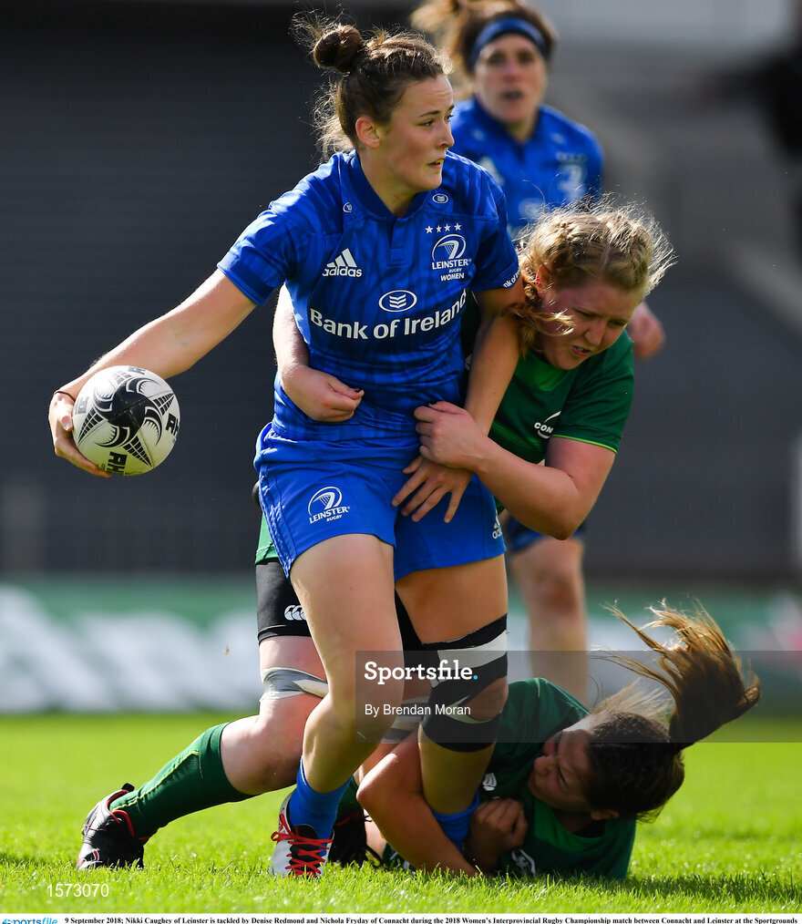 9 September 2018; Nikki Caughey of Leinster is tackled by Denise Redmond and Nichola Fryday of Connacht during the 2018 Women’s Interprovincial Rugby Championship match between Connacht and Leinster at the Sportgrounds in Galway. Photo by Brendan Moran/Sportsfile