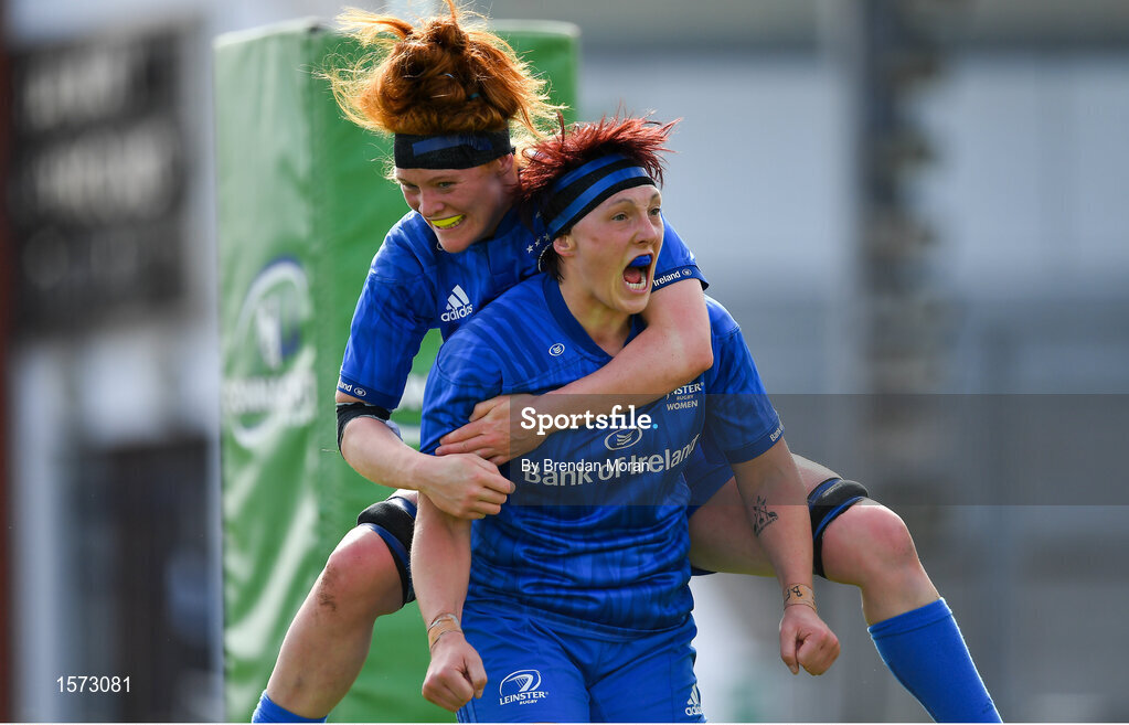9 September 2018; Lindsey Peat of Leinster celebrates with team-mate Juliet Short after scoring her and her side's second try during the 2018 Women’s Interprovincial Rugby Championship match between Connacht and Leinster at the Sportgrounds in Galway. Photo by Brendan Moran/Sportsfile