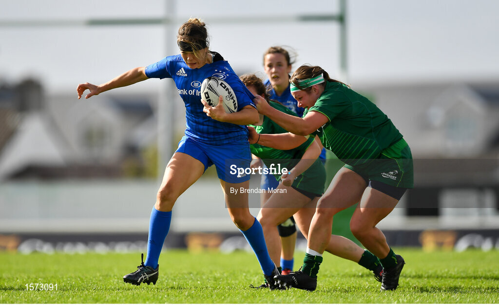 9 September 2018; Jeamie Deacon of Leinster is tackled by Annmarie O’Hora of Connacht during the 2018 Women’s Interprovincial Rugby Championship match between Connacht and Leinster at the Sportgrounds in Galway. Photo by Brendan Moran/Sportsfile