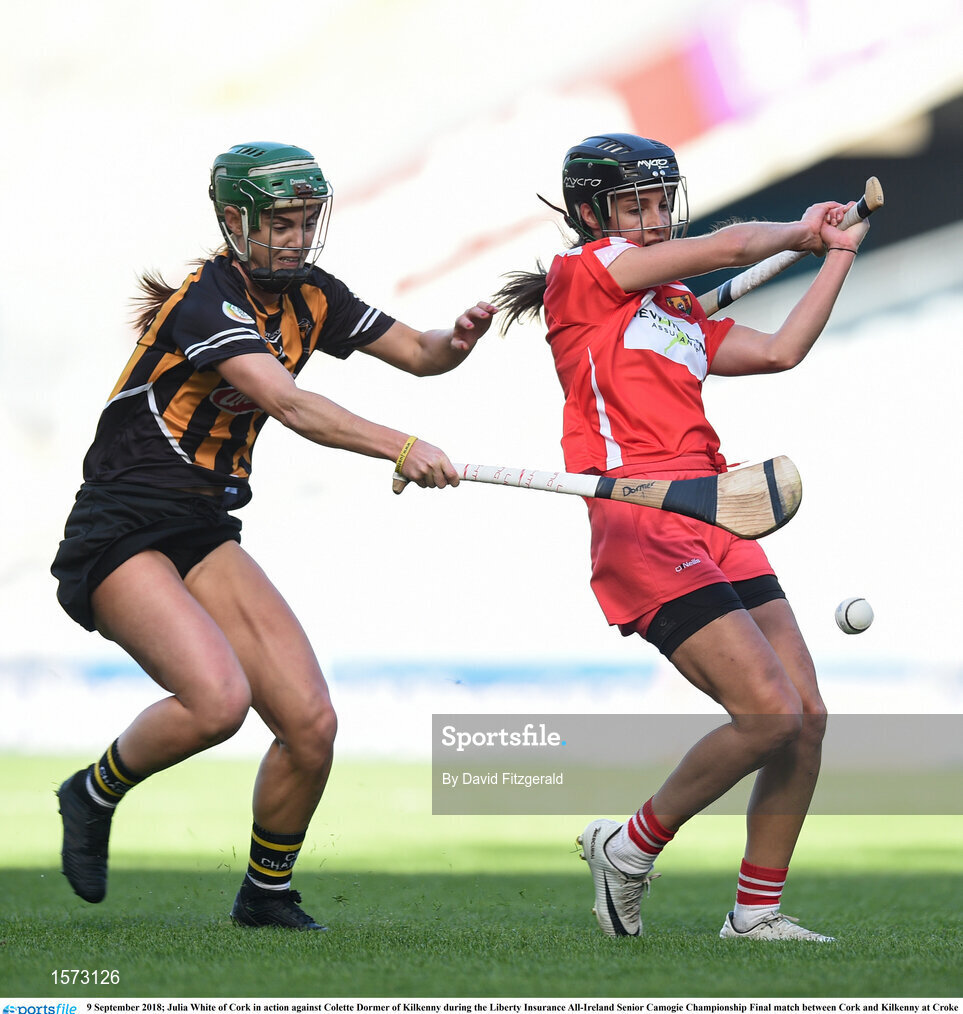 9 September 2018; Julia White of Cork in action against Colette Dormer of Kilkenny during the Liberty Insurance All-Ireland Senior Camogie Championship Final match between Cork and Kilkenny at Croke Park in Dublin. Photo by David Fitzgerald/Sportsfile