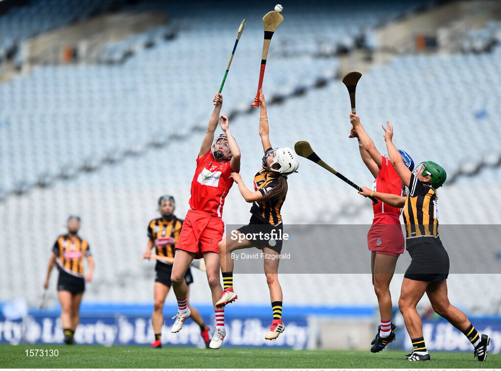 9 September 2018; Katrina Mackey, left, and Lauren Homan of Cork in action against Davina Tobin, left, and Katie Power of Kilkenny during the Liberty Insurance All-Ireland Senior Camogie Championship Final match between Cork and Kilkenny at Croke Park in Dublin. Photo by David Fitzgerald/Sportsfile
