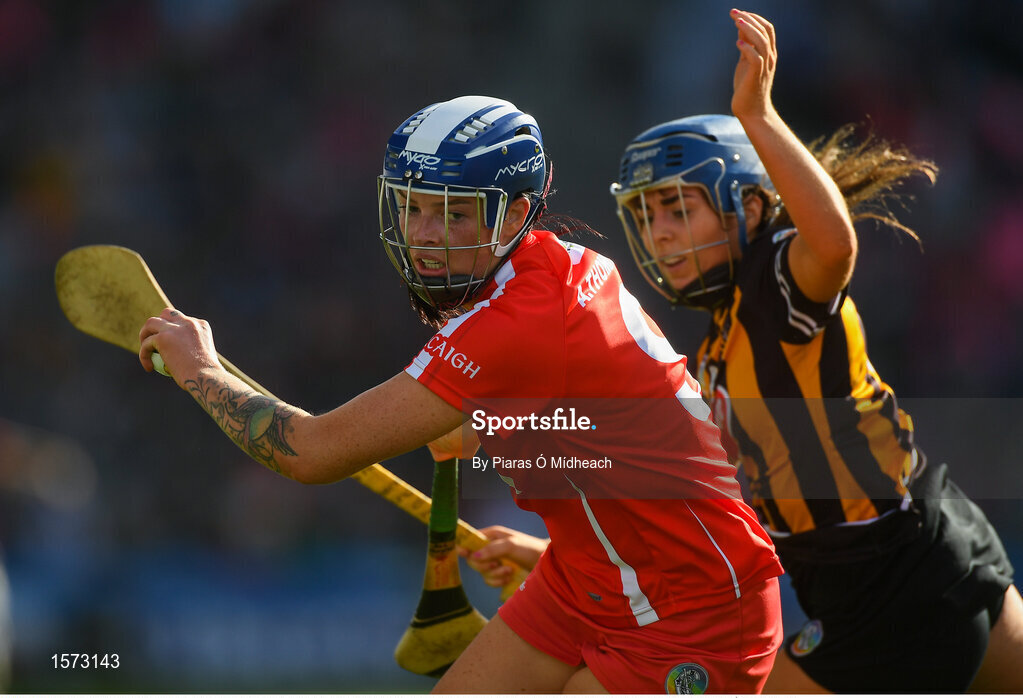 9 September 2018; Ashling Thompson of Cork in action against Katie Power of Kilkenny during the Liberty Insurance All-Ireland Senior Camogie Championship Final match between Cork and Kilkenny at Croke Park in Dublin. Photo by Piaras Ó Mídheach/Sportsfile