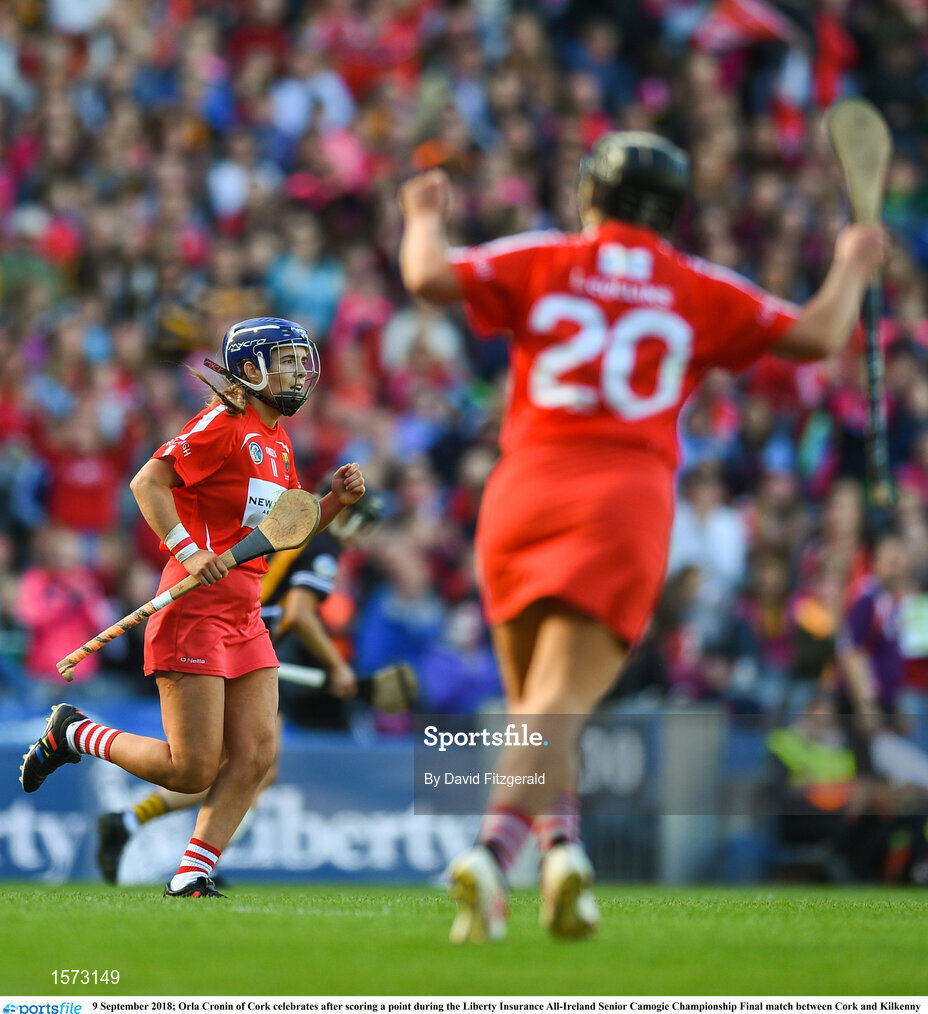 9 September 2018; Orla Cronin of Cork celebrates after scoring a point during the Liberty Insurance All-Ireland Senior Camogie Championship Final match between Cork and Kilkenny at Croke Park in Dublin. Photo by David Fitzgerald/Sportsfile
