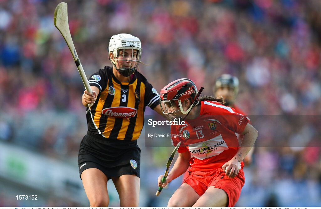 9 September 2018; Katrina Mackey of Cork in action against Catherine Foley of Kilkenny during the Liberty Insurance All-Ireland Senior Camogie Championship Final match between Cork and Kilkenny at Croke Park in Dublin. Photo by David Fitzgerald/Sportsfile