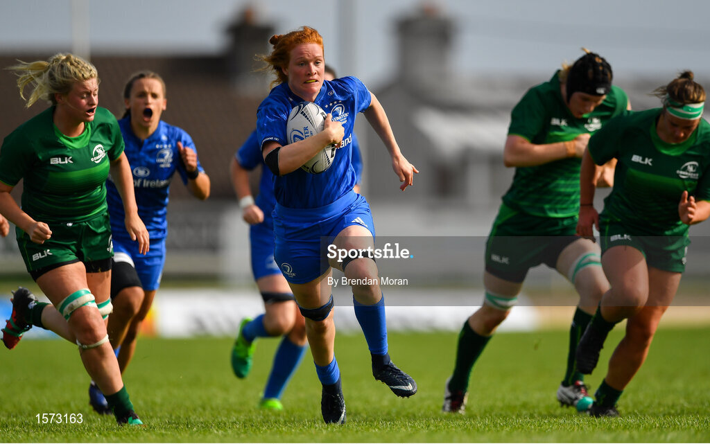 9 September 2018; Juliet Short of Leinster breaks clear of the Connacht defence during the 2018 Women’s Interprovincial Rugby Championship match between Connacht and Leinster at the Sportgrounds in Galway. Photo by Brendan Moran/Sportsfile
