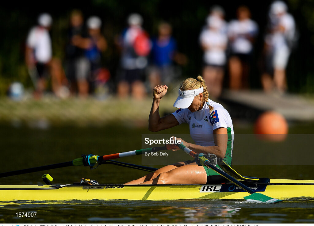 14 September 2018; Sanita Puspure of Ireland celebrates after winning her Women's Single Sculls semi-final on day six of the World Rowing Championships in Plovdiv, Bulgaria. Photo by Seb Daly/Sportsfile