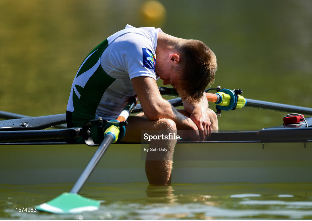 14 September 2018; Jacob McCarthy of Ireland reacts following his team's fifth place finish during their Lightweight Men's Quadruple Sculls final on day six of the World Rowing Championships in Plovdiv, Bulgaria. Photo by Seb Daly/Sportsfile