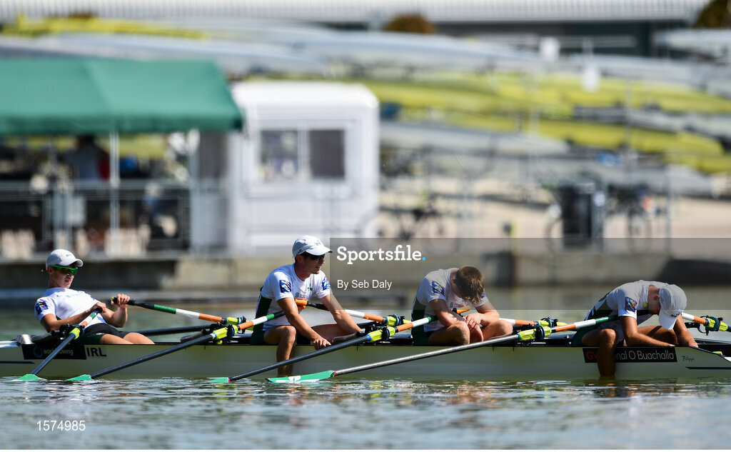 14 September 2018; Ireland team, from left, Fintan McCarthy, Ryan Ballantine, Jacob McCarthy and Andrew Goff following their fifth place finish during their Lightweight Men's Quadruple Sculls final on day six of the World Rowing Championships in Plovdiv, Bulgaria. Photo by Seb Daly/Sportsfile