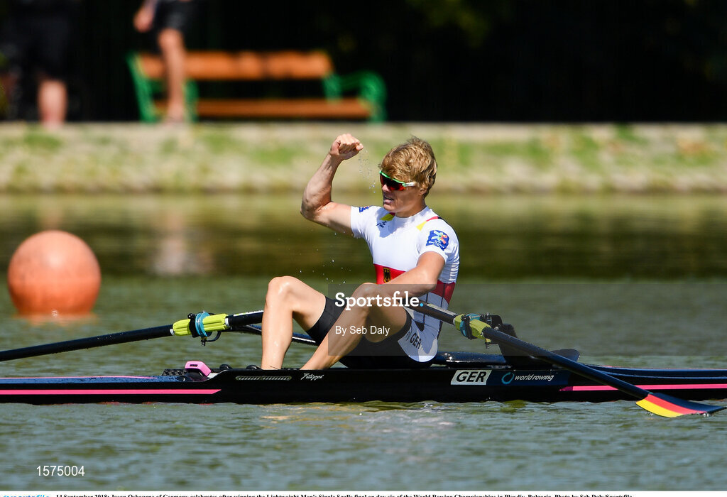 14 September 2018; Jason Osbourne of Germany celebrates after winning the Lightweight Men's Single Sculls final on day six of the World Rowing Championships in Plovdiv, Bulgaria. Photo by Seb Daly/Sportsfile