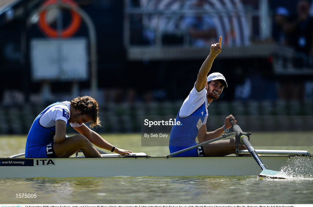 14 September 2018; Alfonso Scalzone, right, and Giuseppe Di Mare of Italy after winning the Lightweight Men's Pair final on day six of the World Rowing Championships in Plovdiv, Bulgaria. Photo by Seb Daly/Sportsfile